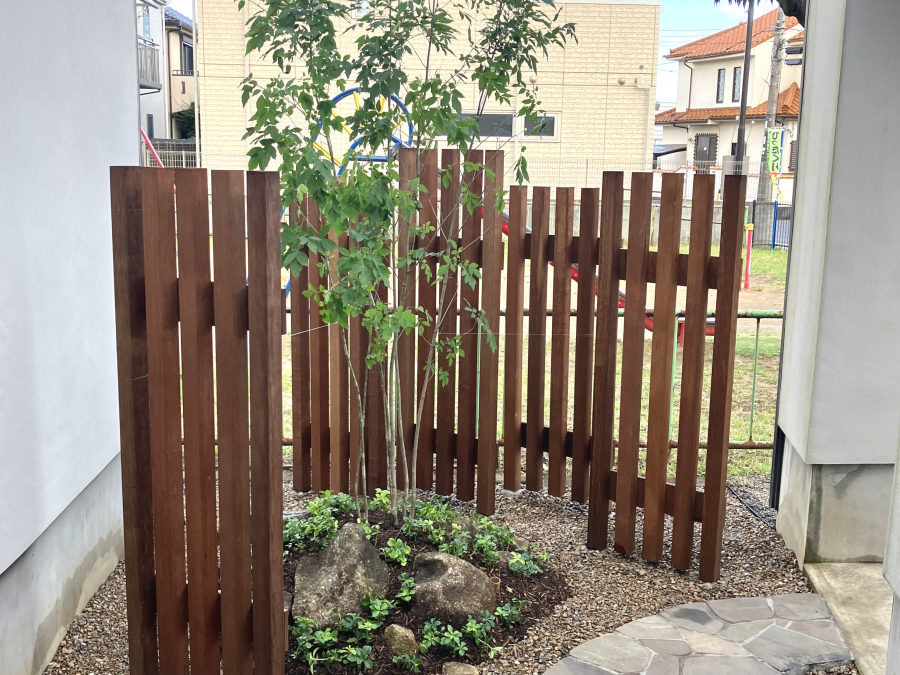 公園に隣接するいい環境のお庭です。駐車場から玄関に入る空間をデザインさせていただきました。